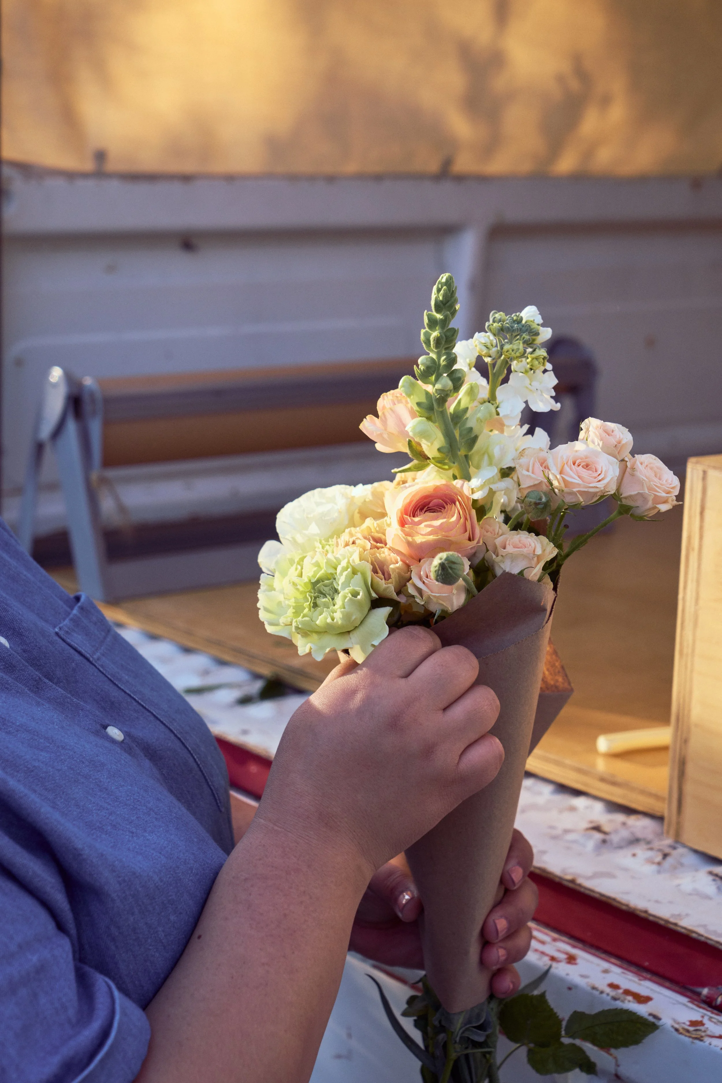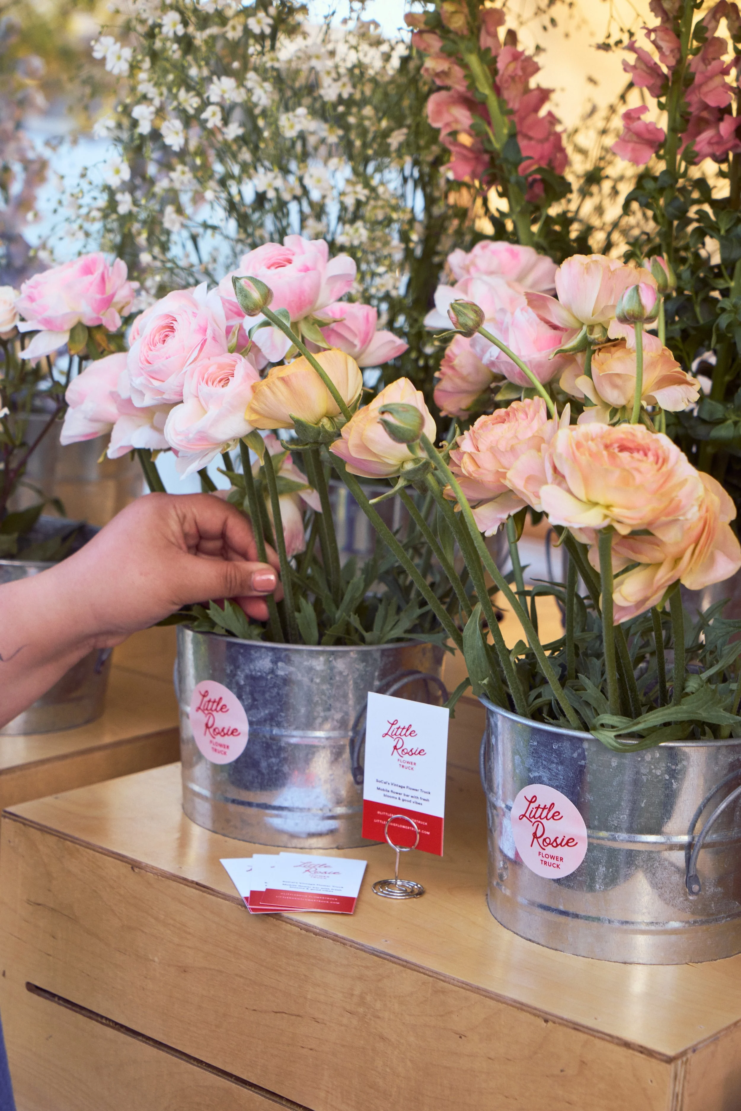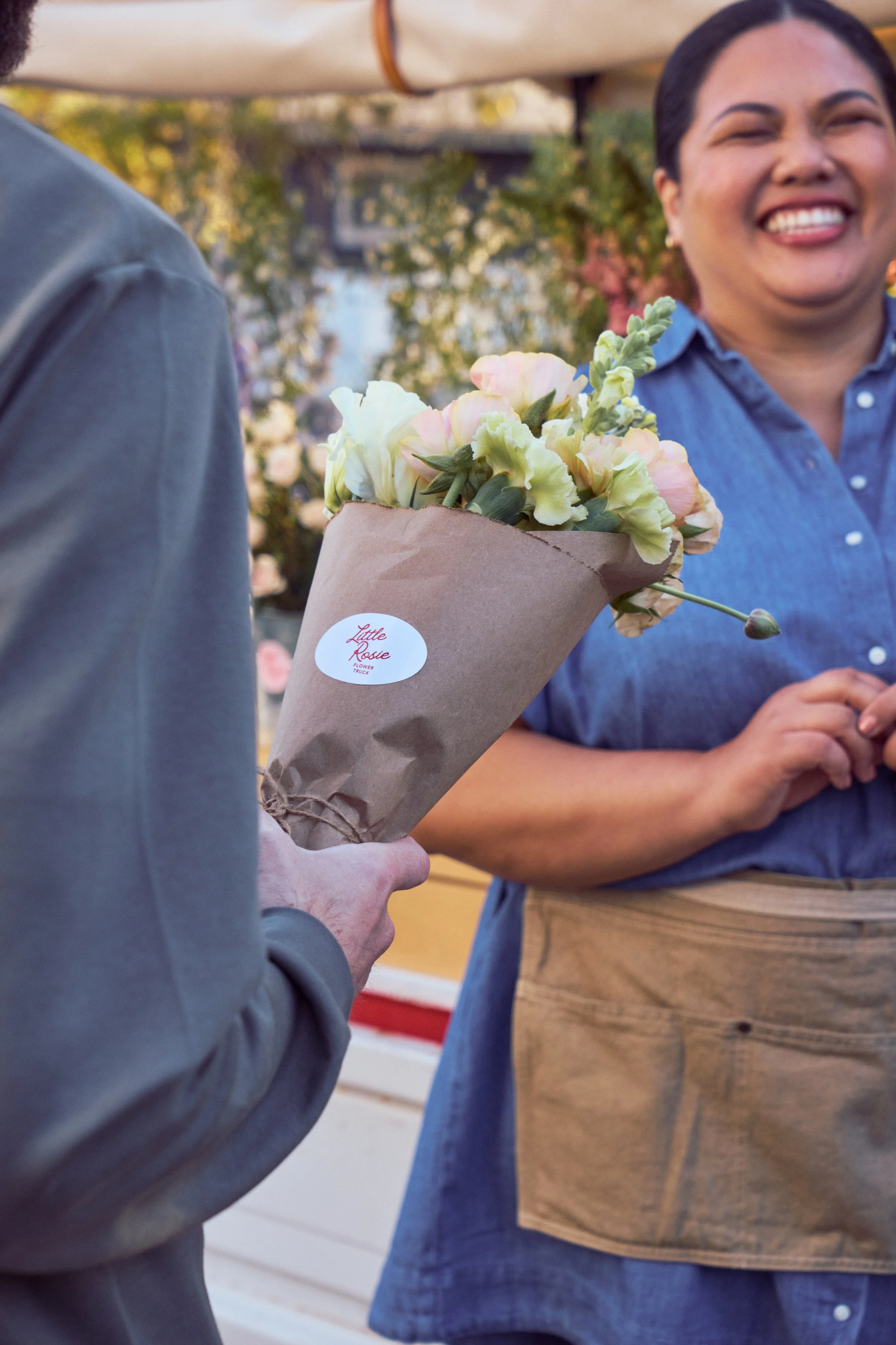 The model is simple and personal. Toni pulls up to coffee shops, schools, markets, brand activations, or private events with buckets of seasonal stems. Guests build their own bouquet, choosing a few favorites or a full armful. Toni guides gently when asked, but mostly gives people room to play. Because when you make your own bouquet, it feels like a love note you wrote yourself.